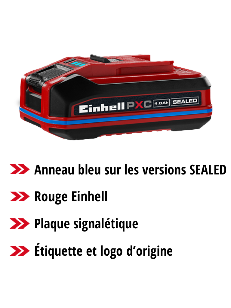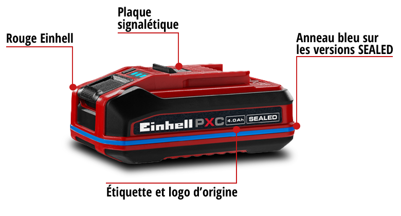 Les batteries Power X-Change originales sont conçues pour être parfaitement adaptées aux appareils Einhell, offrant ainsi des performances optimales. Des mécanismes de sécurité intégrés coupent l'alimentation de la batterie et de l'appareil en cas de problème. La plupart des contrefaçons ne sont pas équipées de tels systèmes intelligents. Par exemple, la batterie ne serait pas coupée en cas de surchauffe. En conséquence, la batterie et l'appareil perdent de la performance à long terme et peuvent même être endommagés dans le pire des cas.