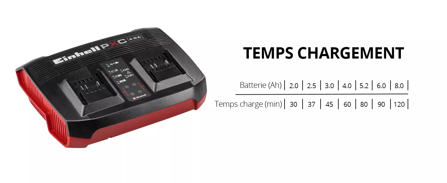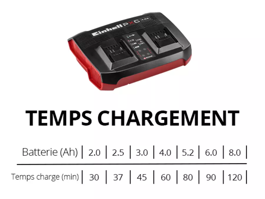 Le chargeur double Power X-Twincharger 4A Einhell fait partie de la gamme de produits combinables à l’infini Power X-Change ; il est ainsi compatible avec toutes les batteries de cette gamme. La technologie de charge rapide 4 A assure des temps de charge jusqu’à 25 % plus courts.