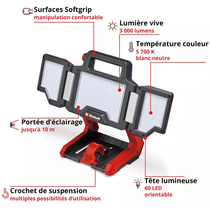 La lampe sans fil TP-CL 18/3000 Li Einhell est équipée de panneaux lumineux réglables. Ces lampes mobiles peuvent couvrir une zone étendue sur 270° maximum. Associée à la tête lumineuse orientable, elles permettent de bénéficier d’un éclairage individuel de grande portée dans un garage, une maison, un jardin ou sur un chantier.
